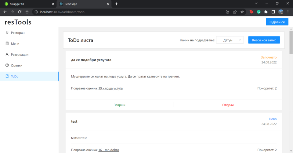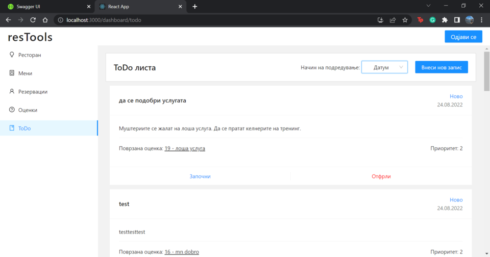 Админот оди на /dashboard страната во табот за "ToDo". Тука ги разгледува сите "ToDos" сортирани според датум или приоритет. За секое може да да го започне или да го отфрли. Одкога е започнато, може да го заврши или да го отфрли. Дополнително може да ја отвори оценката што е поврзана за тоа "ToDo" преку клик на неа.