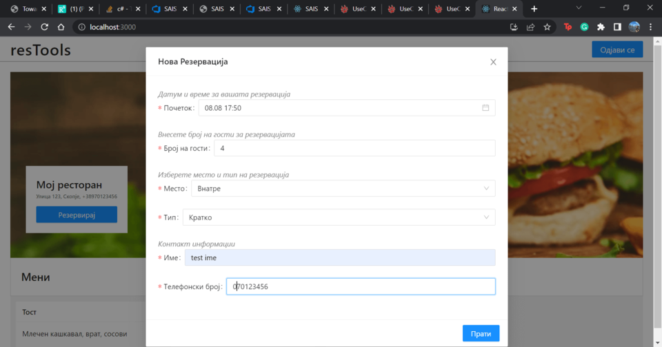 Корисникот клика на копчето резервирај, при што му се појавува следниот модал.