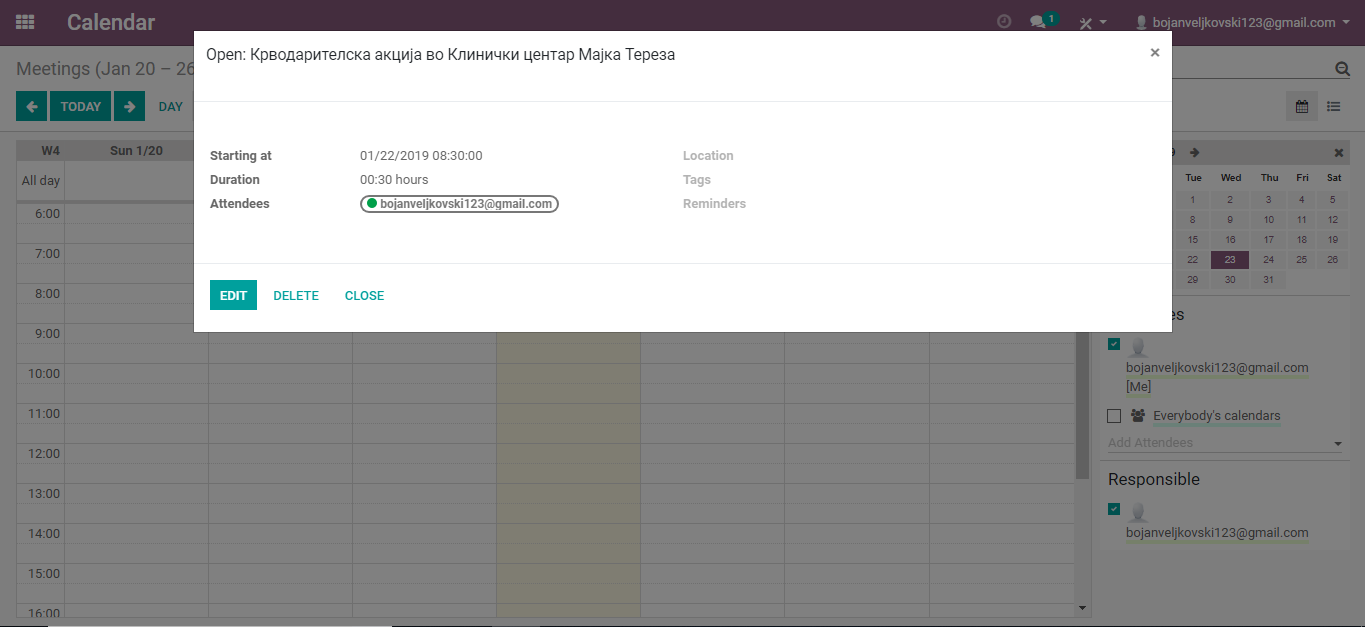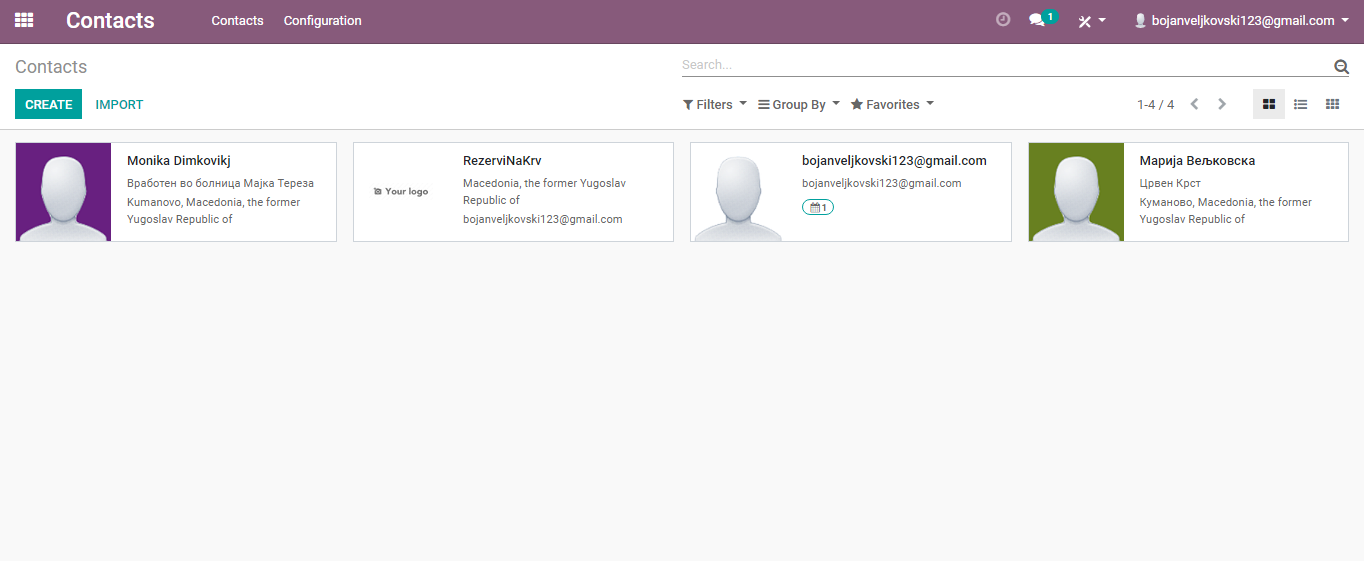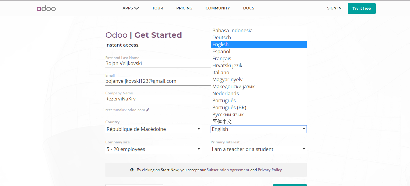 - Odoo е пакет на софтверски решенија со отворен код кои ги покриваат сите наши потреби: CRM, форум, инвентар, регистрирање на корисници, креирање настани, календар на настани, податоци за регистрирани корисници и сл. Исто така е и веб базиран софтвер. Основачот е Fabien Pinckaers и за прв пат е пуштен во употреба 2005 година. Одлучивме да го искористиме оваа софтверско решение, бидејќи цената за користење е мала во споредба со останатите решенија. За регистрирање на 1 корисник се плаќа 10 евра но постои и можност за слободно користење на софтверот одреден временски период. Ние ја искористивме демо верзијата, и според тоа одлучивме дека покрива 90% од студиите на случаи. Потребни се некои мали надоградби, со цел да се задоволат сите барања на нашиот систем. (3)