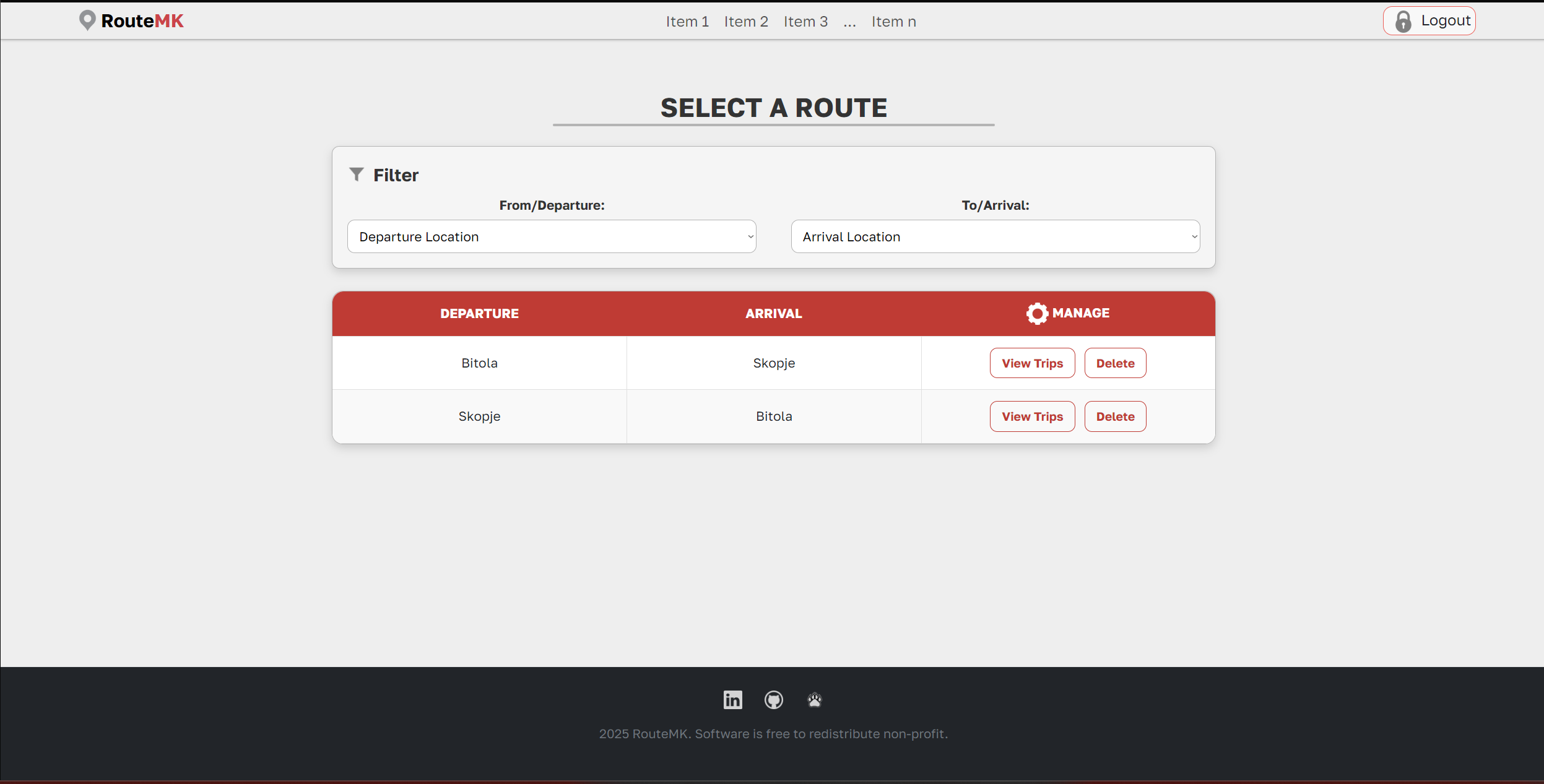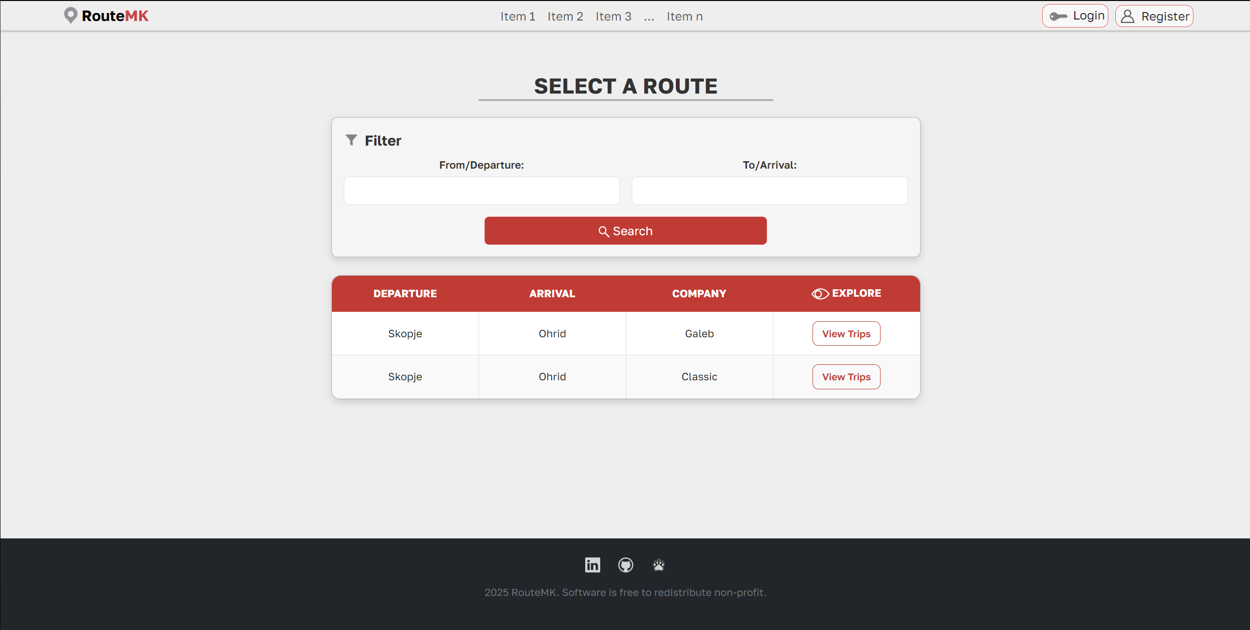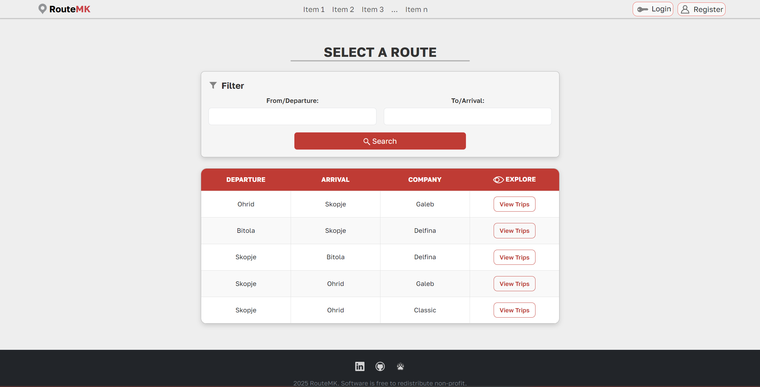 It supports both viewing all routes by default and filtering routes based on user input (departure and arrival locations).