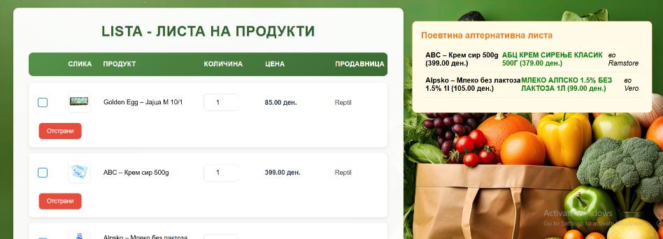 | 19 | Предлог на поевтина алтернативна листа | Системот предлага листа со исти продукти како во избраната, но во друг маркет каде што се поевтини |