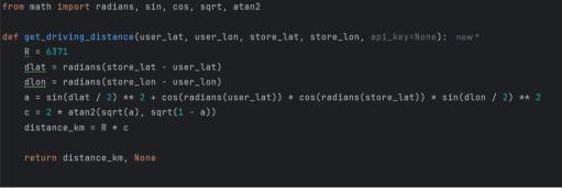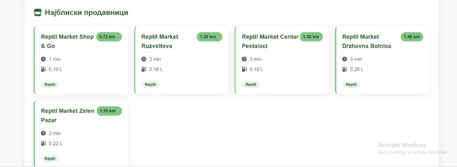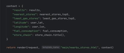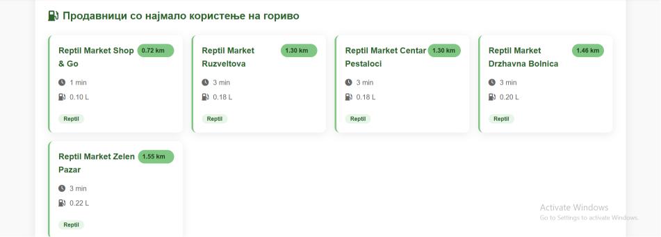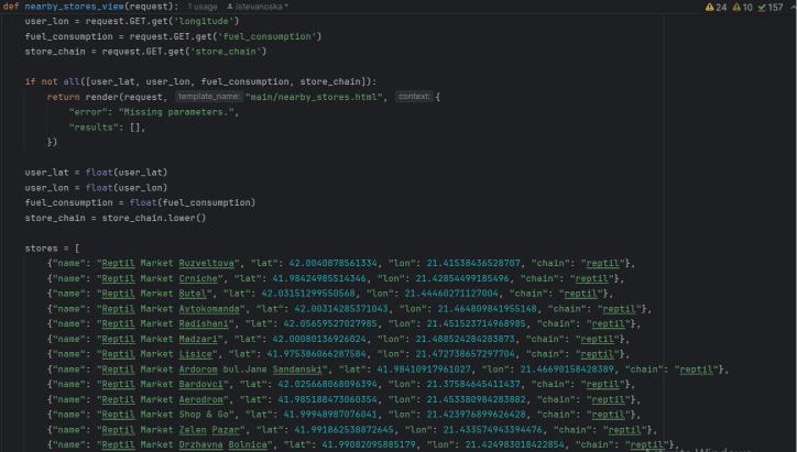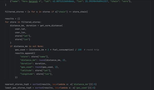 Овој код овозможува корисникот да најде најблиски продавници од избраниот ланец врз основа на неговата тековна локација и потрошувачката на гориво. Се филтрираат продавниците според ланецот, а потоа се пресметува растојанието и потребното гориво за патување до нив. На крај, системот враќа листа со најблиските пет продавници и петте најисплатливи во однос на потрошувачката на гориво, со што му помага на корисникот да избере оптимална дестинација.