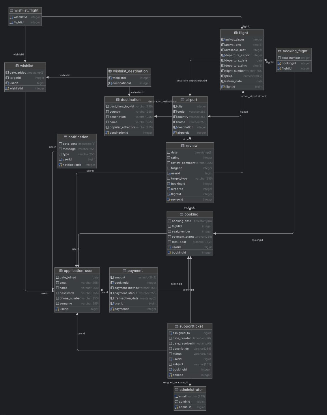 Flight ( FlightID, Flight number, DepartureAirportID*, ArrivalAirportID*, Departure time, Arrival time, Duration, Price, Available seats )
