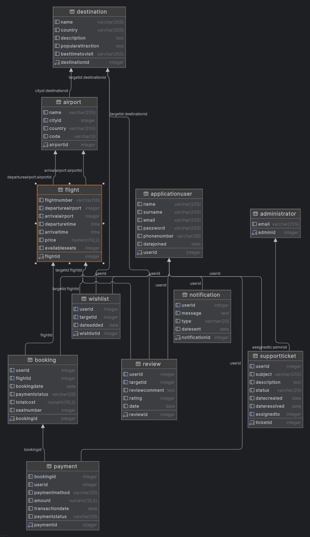 Flight ( FlightID, Flight number, DepartureAirportID*, ArrivalAirportID*, Departure time, Arrival time, Duration, Price, Available seats )