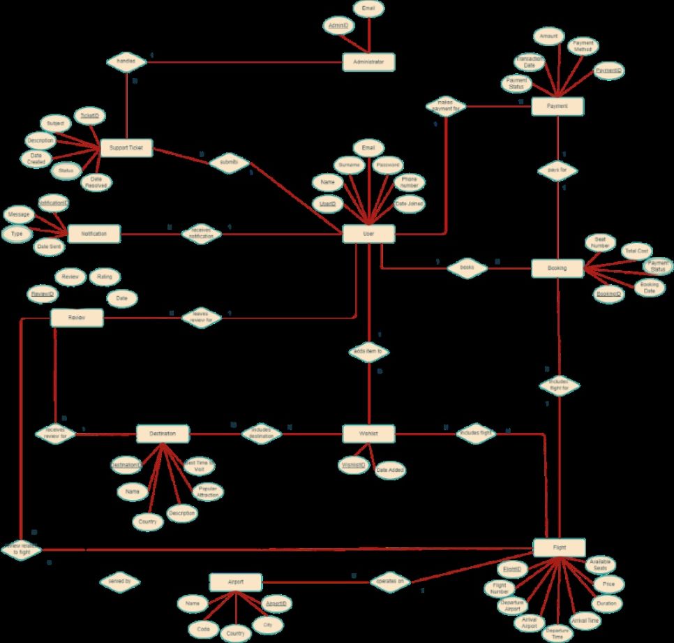 - includes - релација помеѓу Flight и Booking. Секој Flight може да има повеќе Bookings, но еден Booking е линкуван со само еден Flight.