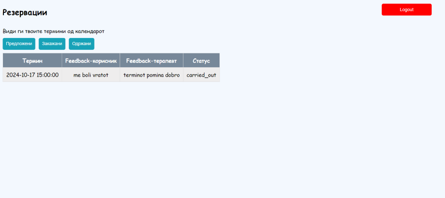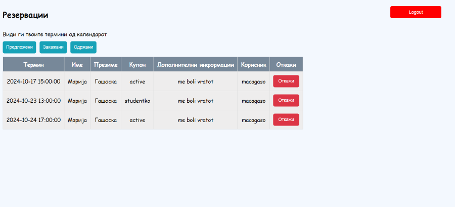 На оваа страна корисникот може да добие увид кон термините кои се предложени(сеуште непотврдени за закажани од аминистраторот), закажани(предложени од корисникот и прифатени за закажани од аминистраторот) и одржани. Со клик врз копчето откажи корисникот може да откаже термин кој е предложен или закажан.