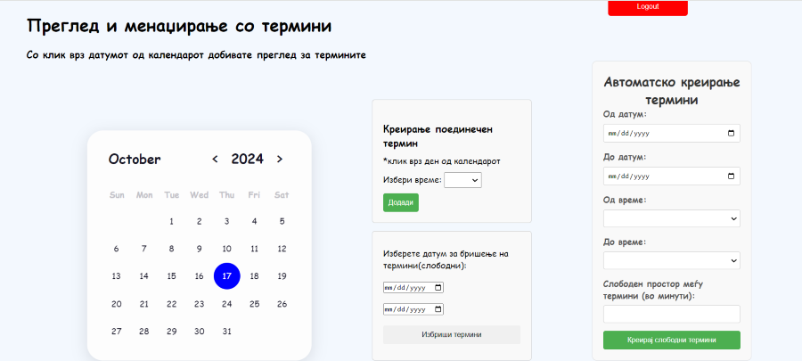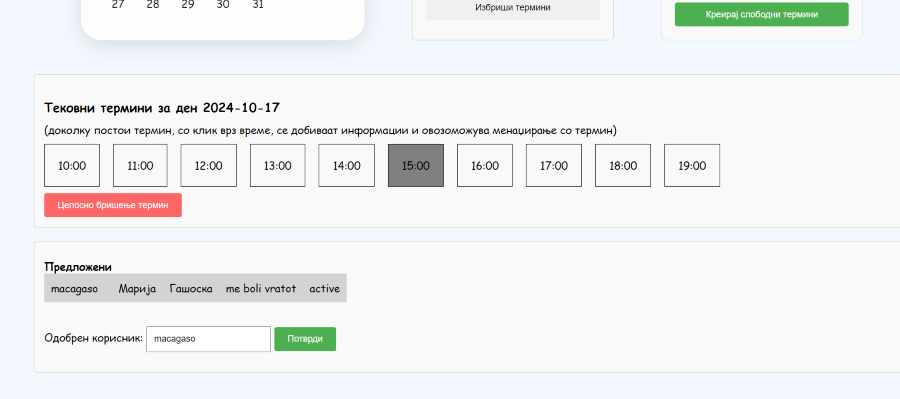 Со клик врз некој ден од календарот, се прикажуваат термините кои се водат за слободни од аминистраторот