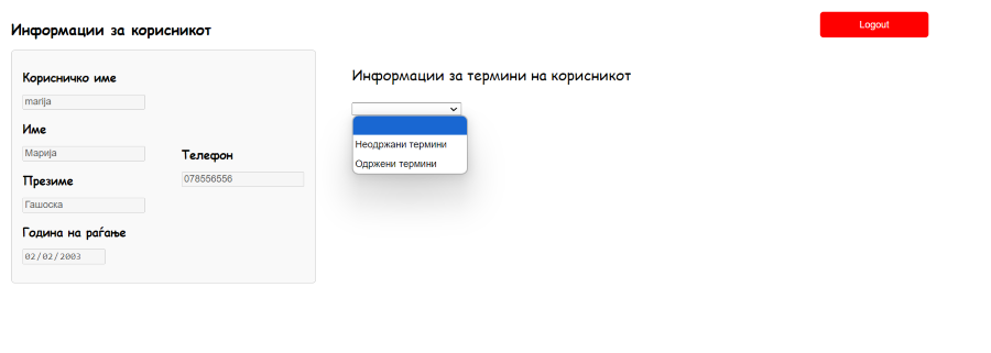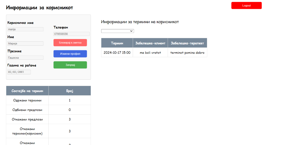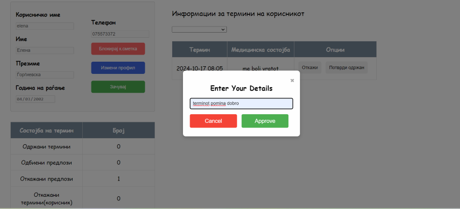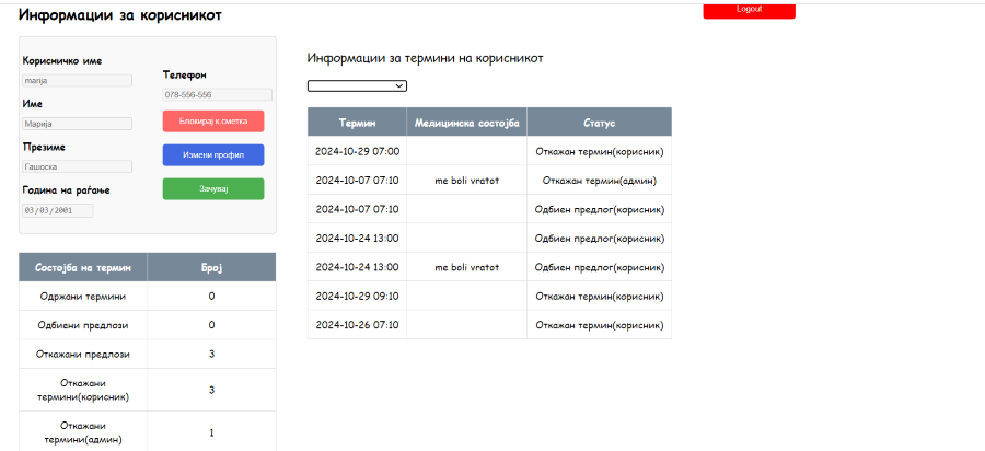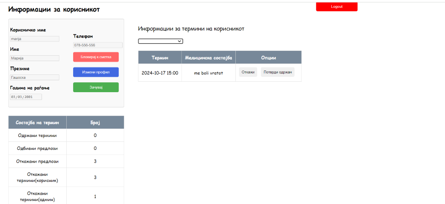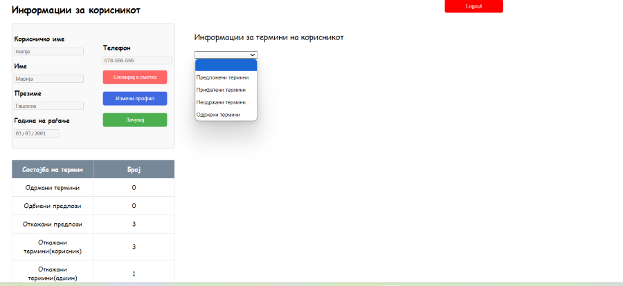 На оваа страница може да менуваме податоци за корисникот, да блокираме/активираме корисничка сметка како и да добиеме детален увид во состојбата со термините на корисникот. Од паѓачко мени може да се бира меѓу предложени, прифатени, неодржани и одржани термини.