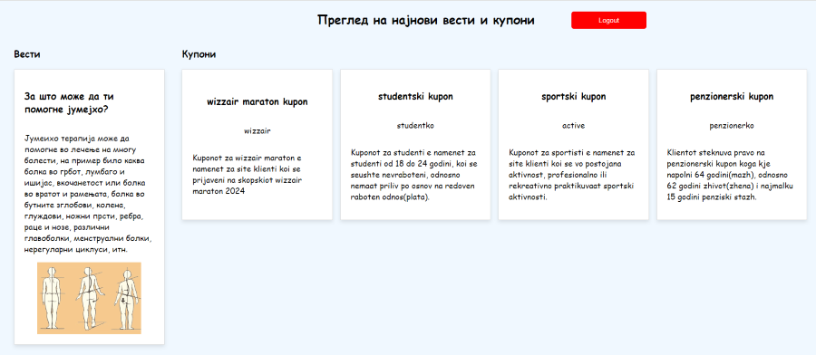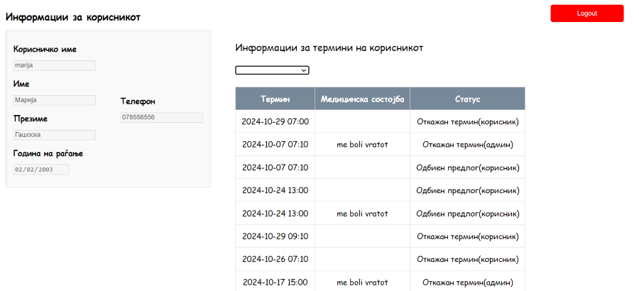 Корисникот има преглед кон личните податоци кои ги оставил при креирање корисничка сметка и притоа само администраторот може да ги измени овие податоци поради сензитивноста и важноста на истите. Постои можност, корисникот да направи преглед на термините кои не се одржани, како и причината за неодржувањето на терминот.