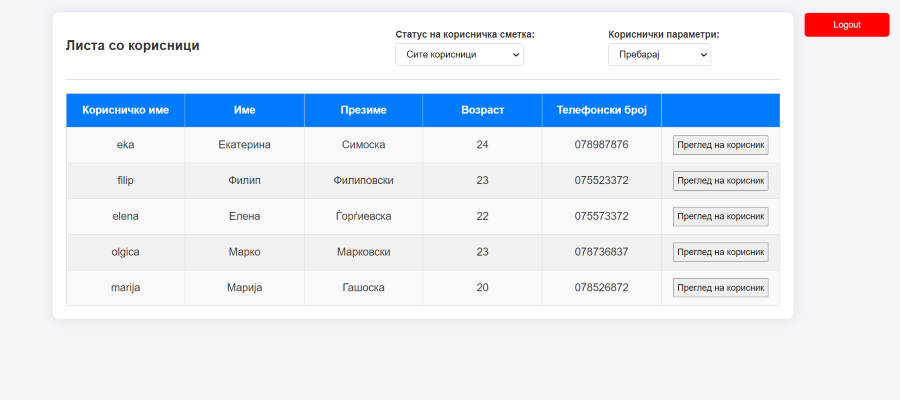 На оваа страница може да добиеме увид во сите активни, блокирани корисници, како и да пребаруваме корисници според одредени параметри. Со клик на копчето за преглед може да добиеме детален увид во корисничката сметка