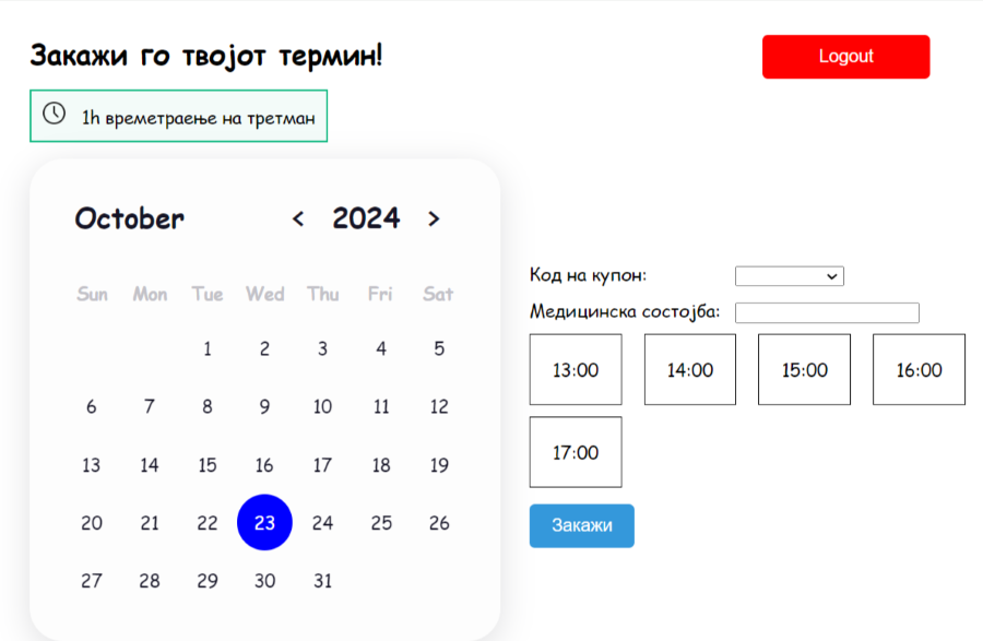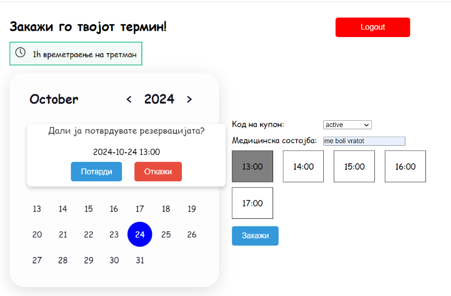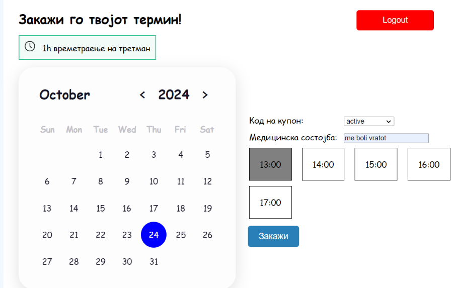 Клик врз терминот(часот) во текот на конкретен ден, избор на купон(опционално) и оставање забелешка за администраторот се чекорите кои ги извршува корисникот, за да може да закаже термин