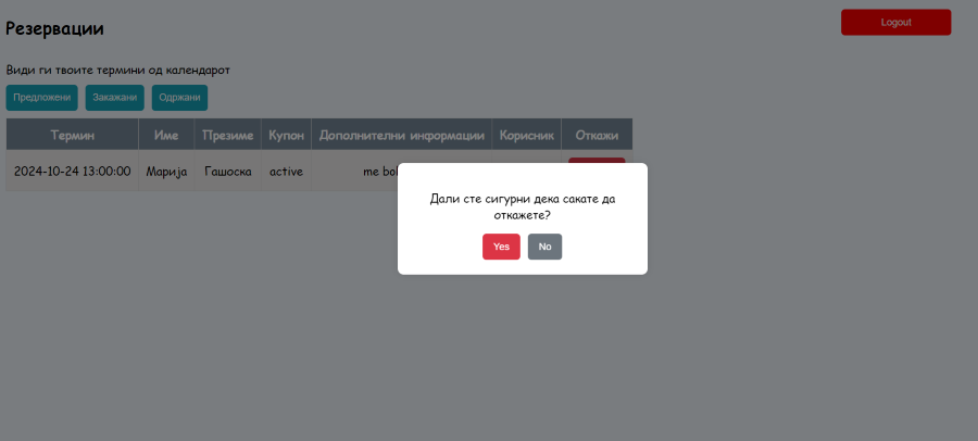 Со клик врз терминот доколку е резервиран, се прикажува корисникот за кој е резервиран терминот и две опции-со клик на копчето "Потврди" се потврдува терминот како одржан и администраторот може да остави коментар за терминот и "Бриши" со кое се брише закажаниот термин