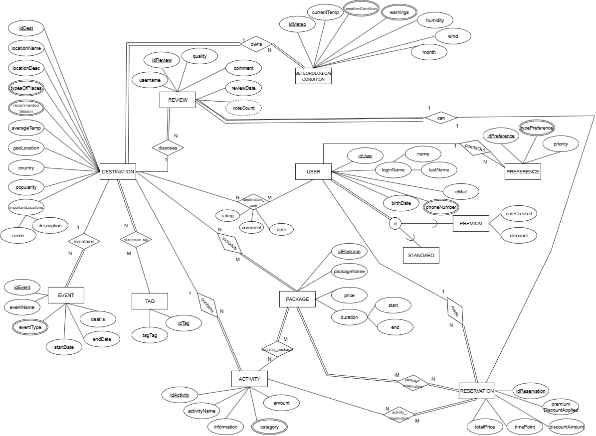 - REVIEW – ентитет кој ги опфаќа рецензиите што корисниците ги оставаат за дестинациите.