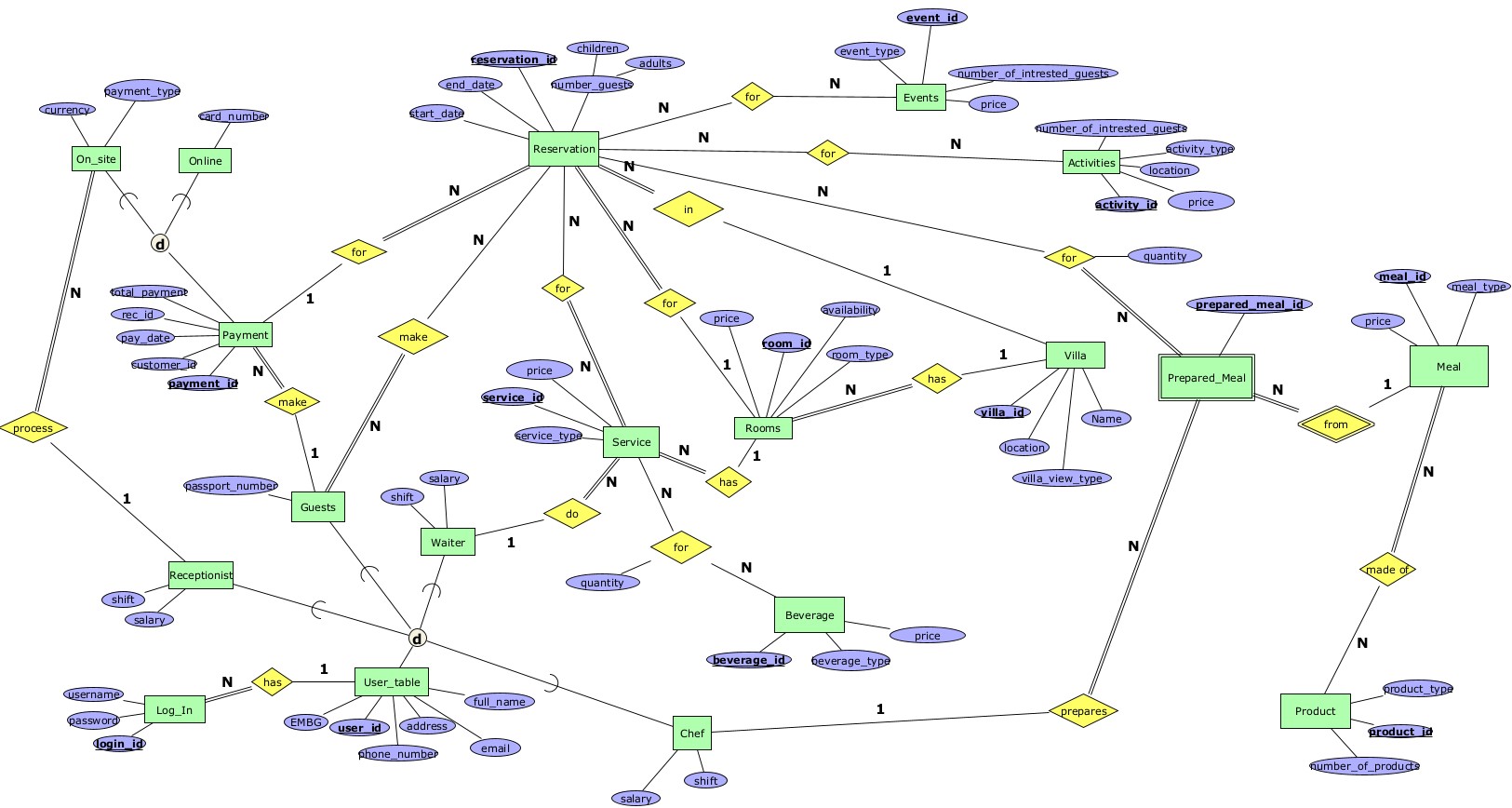 4.guests_make_reservation - N:N, релација помеѓу ентитет Guests и Reservation. Тотално учество од страна на ентитетот Guests.