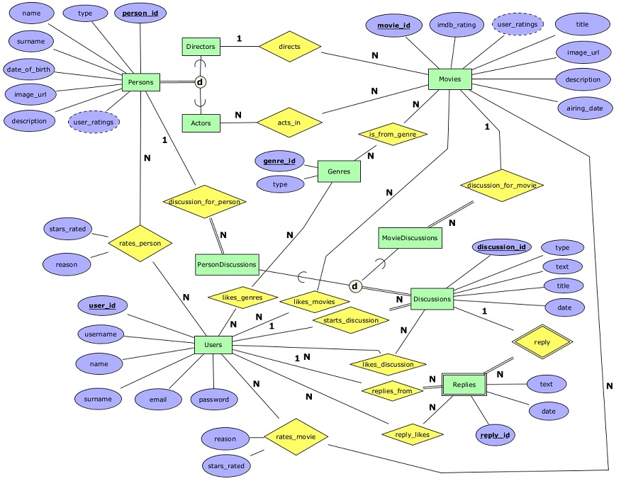 - Кај ентитет Discussions додаден текстуален атрибут type за означување дали припаѓа на MoviesDiscussions или PersonDiscussions.