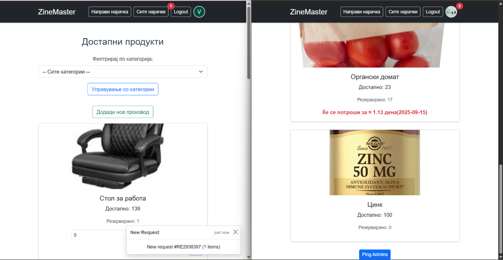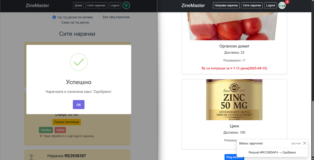 ИД Х - Добивање на нотификации при креирање на нарачка(ако е администратор на производи) и менување на статус на нивна нарачка(за сите кроисници)